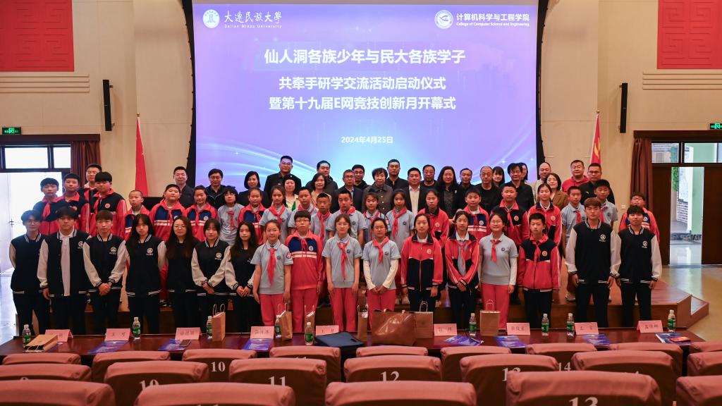 4月25日,计算机科学与工程学院举行仙人洞镇青少年与民大学子共牵手研学交流活动启动仪式暨第十九届E网竞技创新月开幕式。副校长白日霞,党委常委、党委组织部部长王慧,庄河市仙人洞镇人大主席郭辉、副镇长张汉涛参加仪式。计算机科学与工程学院党委书记云健主持仪式。