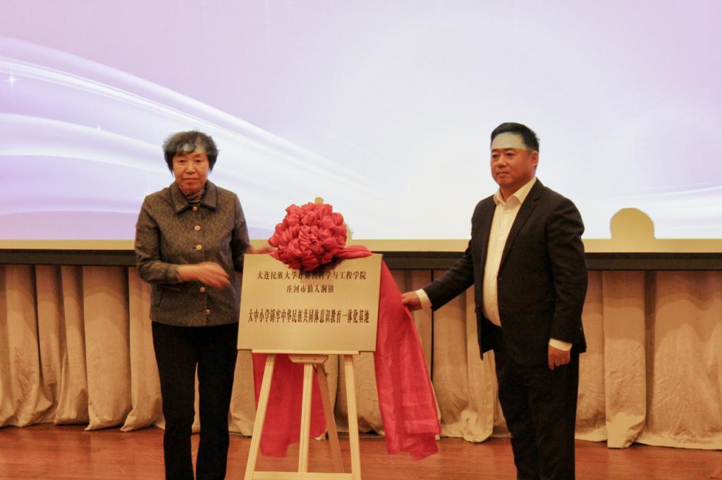 在启动仪式上,白日霞与郭辉共同为“大连民族大学计算机科学与工程学院—庄河市仙人洞镇大中小学铸牢中华民族共同体意识教育一体化基地”揭牌。