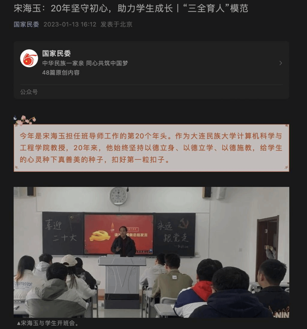 今年是宋海玉担任班导师工作的第20个年头。作为大连民族大学计算机科学与工程学院教授,20年来,他始终坚持以德立身、以德立学、以德施教,给学生的心灵种下真善美的种子,扣好第一粒扣子。