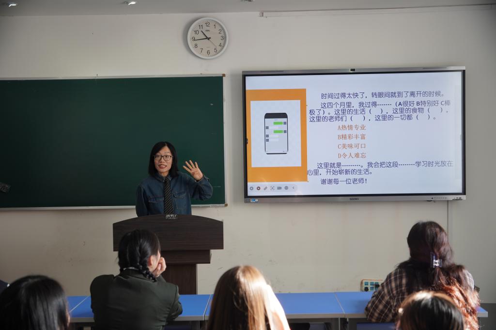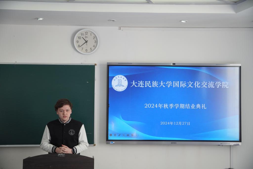 国际文化交流学院直属党支部书记辛会芳宣读了2024年秋季学期结业留学生名单。随后,刘俊民副院长为每位同学颁发结业证书。来自俄罗斯布里亚特国立大学的交换生东方朔同学作为留学生代表发言,他代表同学们对我校的精心培养表示真挚感谢,并表示将把在学校的所见、所闻、所学带回到俄罗斯,让更多人了解大连民族大学、了解中国。于珏慧老师作为教师代表,用一堂生动有趣的“人生汉语课”与留学生们交流。在一道道选择题背后,是人生没有唯一答案的宽阔与自由。
