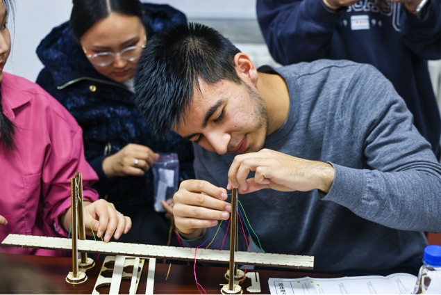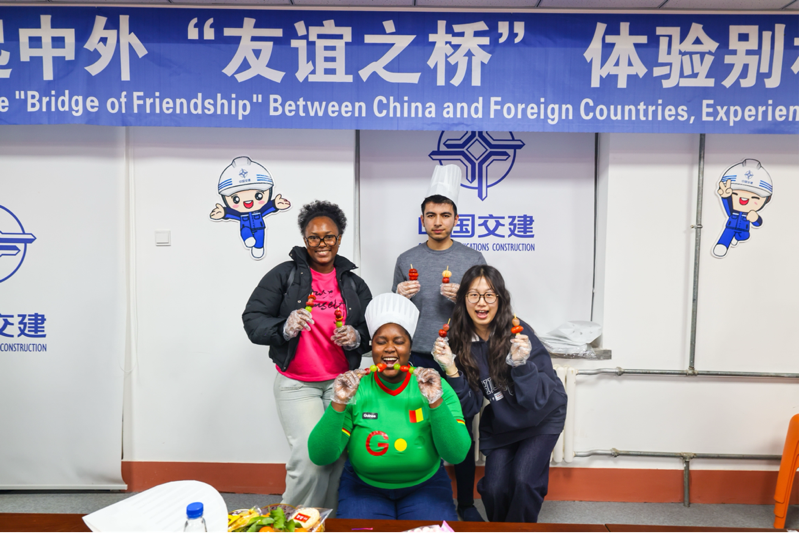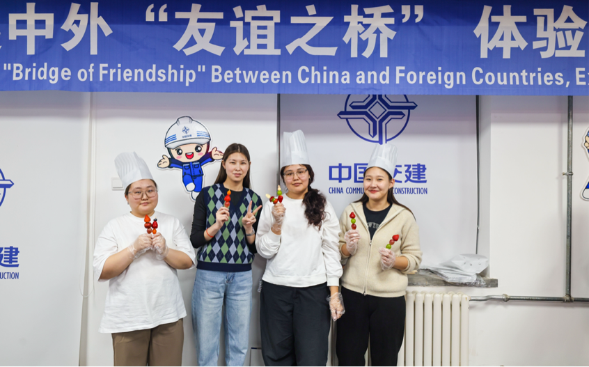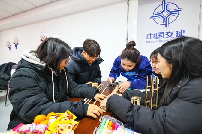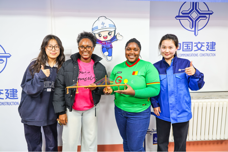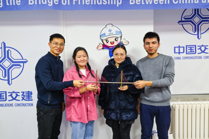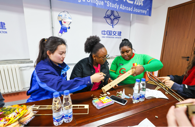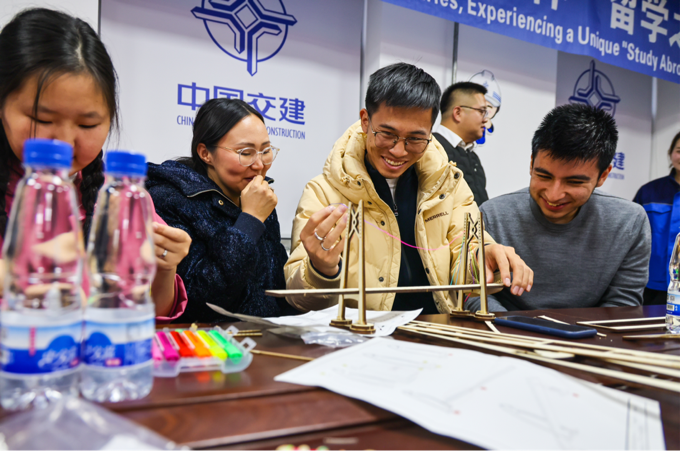 动手搭建,梦想的桥梁在心中生根。留学生们与中国工程师共同搭建象征友谊的“大桥模型”并写下自己的祝福。