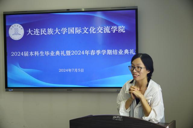 于珏慧老师作为任课教师代表发言,她精心制作了视频向每位同学们献上衷心的祝福。视频以轻松幽默的风格为留学生上了一堂“毕业汉语课〞,鼓励留学生继续探索中国文化,成为文化交流中最生动、最活泼的文化使者。