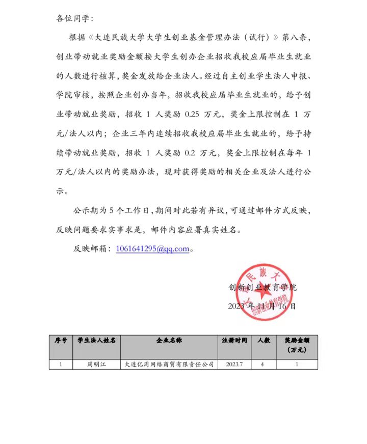 关于 2023 年度大学生自主创业带动就业奖励结果公告