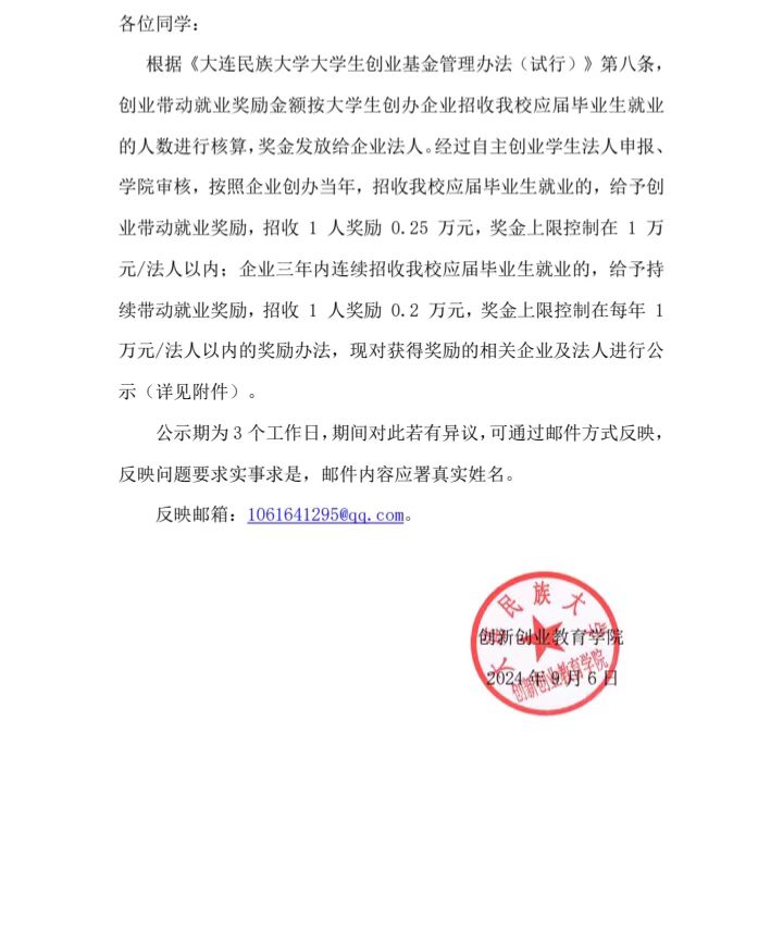 关于 2024 年度大学生自主创业带动就业奖励结果公告
