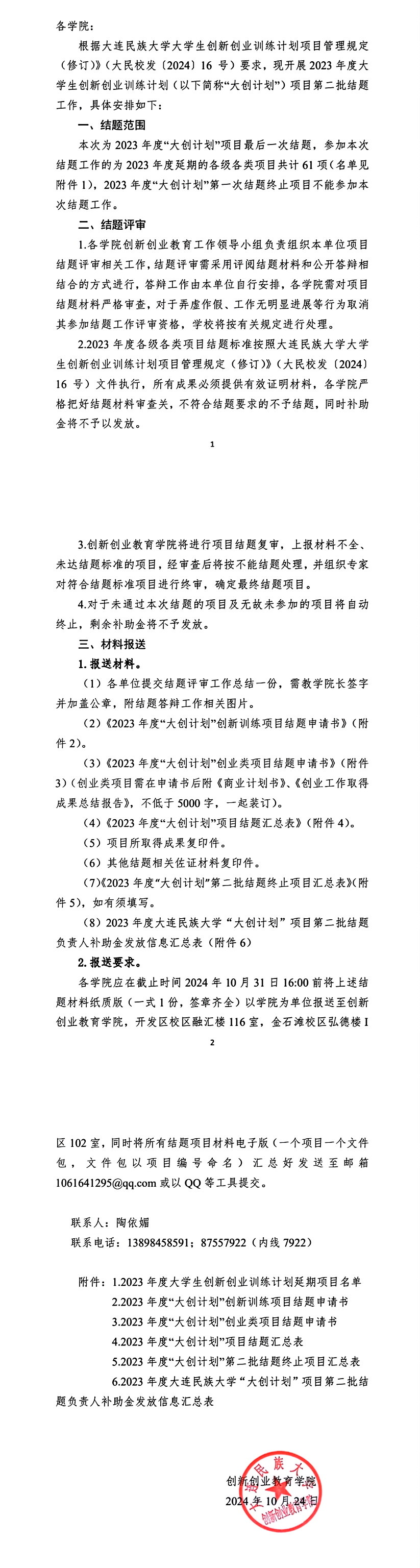 关于开展 2023 年度大学生创新创业训练计划项目第二批结题工作的通知