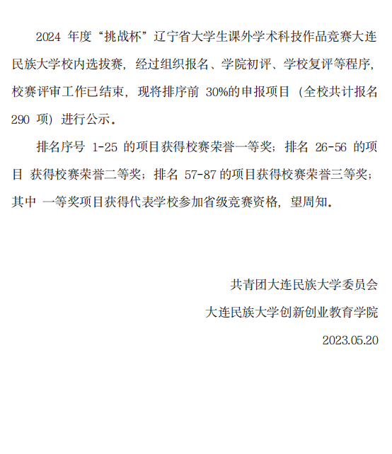 2024 年“挑战杯”辽宁省大学生创业计划竞赛 大连民族大学校内选拔赛成绩及晋级名单公示
