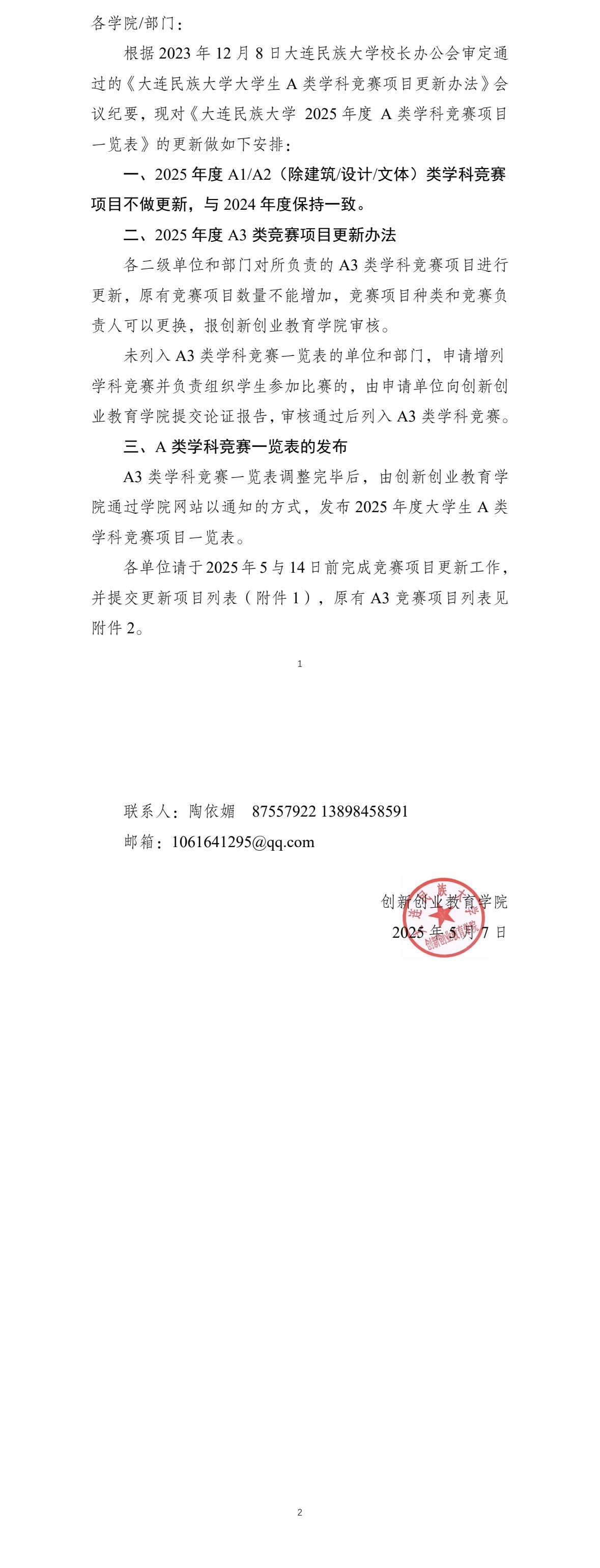 关于2025年度大学生A类学科竞赛项目一览表的更新通知