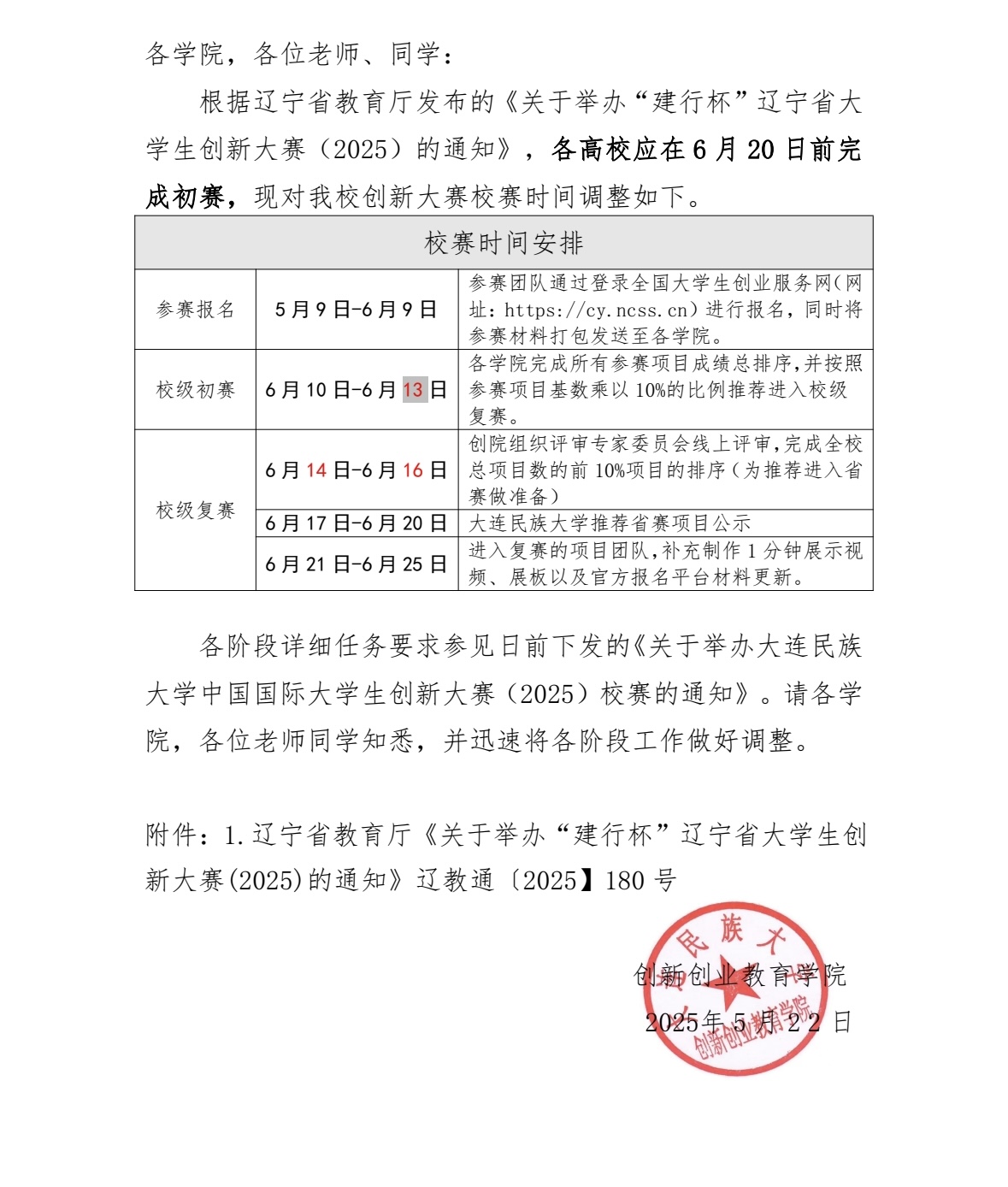 关于调整大连民族大学中国国际大学生创新创业大赛(2025)校赛时间的通知