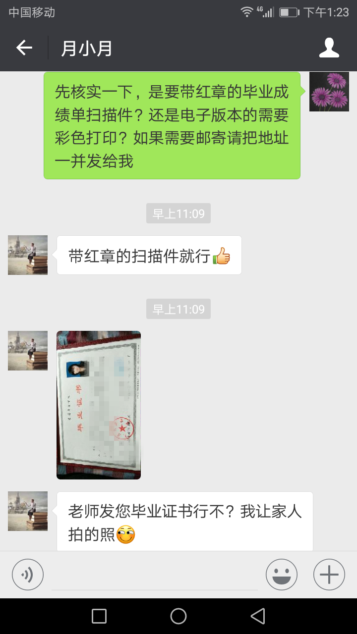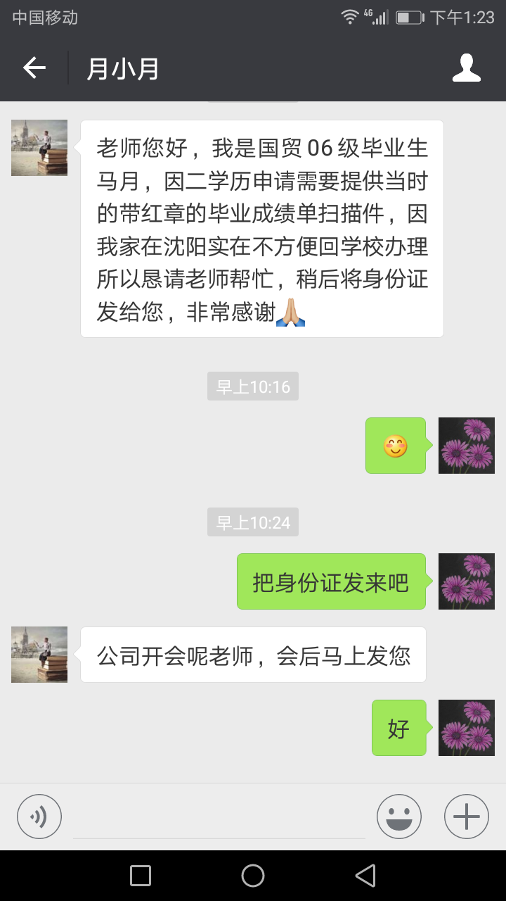 4月16日上午十点多,宋江岩馆长接到一位住在沈阳的毕业生查档电话,对方称“我是国贸06级毕业生马月,因二学历申请需要提供当时的带红章的毕业成绩单扫描件,因我家在沈阳实在不方便回学校办理,所以恳请老师帮忙。”这类情况属于远程查档,宋馆长当即让马月加自己的微信,请马月同学发来身份证或毕业证这类能够核对真实身份的证件图片。同时,还询问是要带红章的毕业成绩单扫描件还是电子版本的彩色打印。马月没想到母校能提供这么方便的服务,过一会给宋馆长发来毕业证书的图片,刘娟霞老师随即核准身份,就为马月同学办理了成绩单数字扫描件。就这样,身在异地的同学通过互联网你来我往的,很快就办理好查档。对此,马月同学很满意地发来留言“感觉特别暖心,本来是挺忐忑的,觉得搞不好会很麻烦,但是没想到老师态度特别好,而且也没强制要求去学校啥的,非常人性化,特别感谢,希望母校越来越好!”