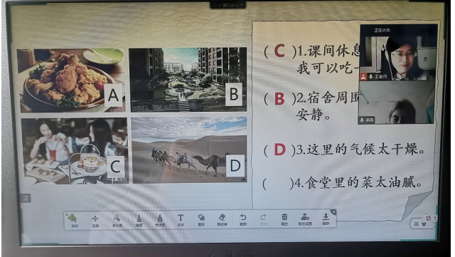 本科1班的《汉语口语课程》上,于珏慧老师正在鼓励留学生介绍品尝过的中国饮食,以规定主题开展讨论,并根据讨论与反馈来讲解重点。这种互动式教学方法,不仅能够抓住屏幕另一边学生的注意力,还能提高学生的参与度,让学生真正喜欢线上课堂。