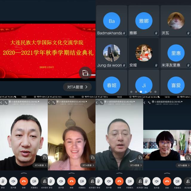 国际文化交流学院直属党支部书记刘晓东宣读2020-2021学年秋季学期结业留学生名单,祝贺22名留学生顺利结业。来自俄罗斯莫斯科的罗鹂鹂同学作为留学生代表发言,她表示虽然新冠肺炎疫情给学习和生活带来了前所未有的挑战和精神压力,但老师们的精彩授课以及同学们的关心帮助弥补了自己不能到校学习的遗憾,感谢学校和老师们对于留学生们的关心帮助,祝福各位老师身体健康,愿同学们能够不忘初心,向着梦想前进。苏明老师作为任课教师代表向同学们表达了殷切的祝福,她表示各位同学面对困难决不放弃的勇气和精神让老师们感到骄傲,同学们对学校的期待和信任 给了老师们努力工作的动力,同学们的进步和微笑让老师们感受到责任和荣光,期待今后会有机会在大连民族大学相见!