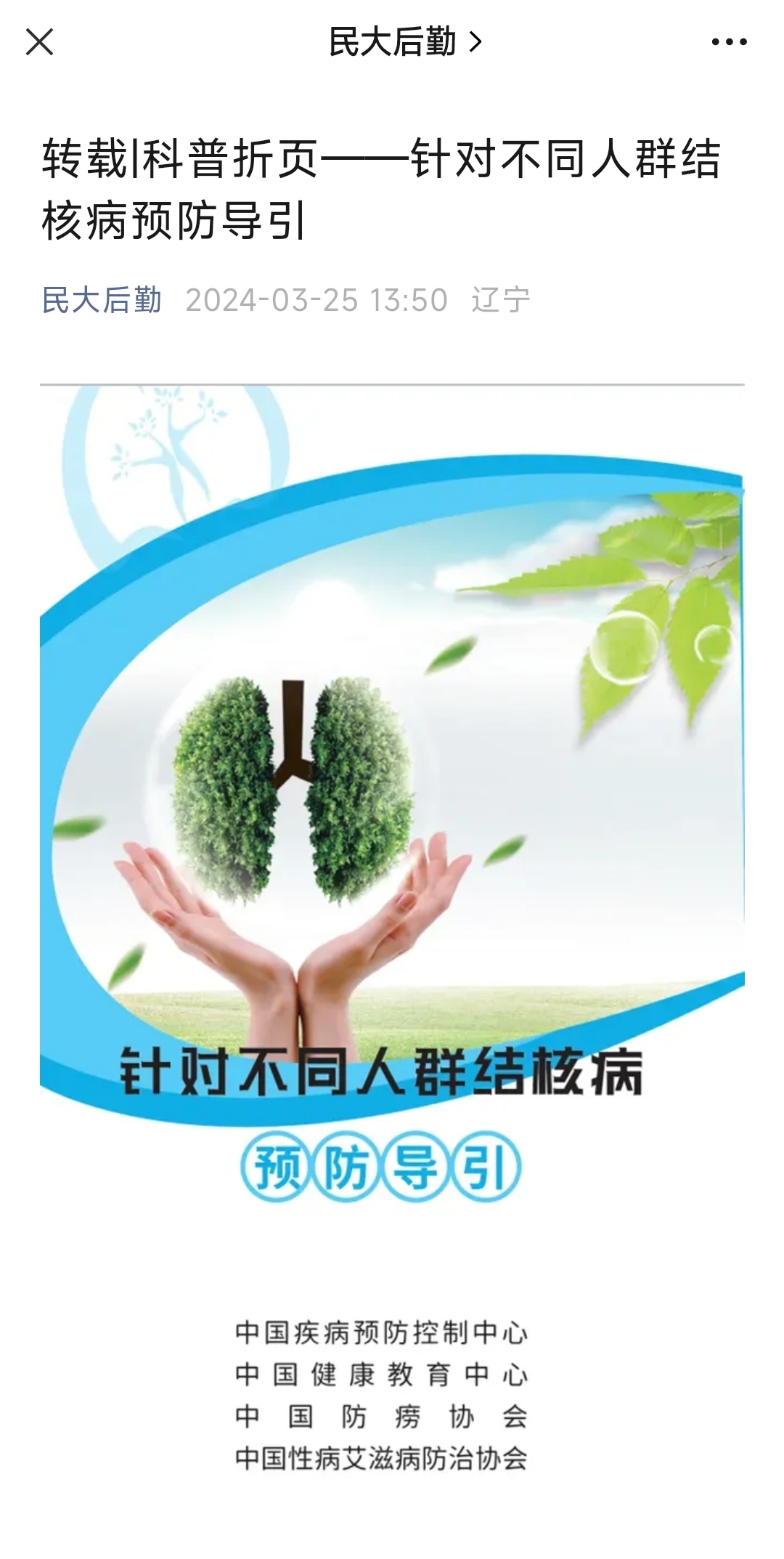 二、通过民大后勤微信公众号、QQ群、微信群等推送结核病防治知识给全校师生。