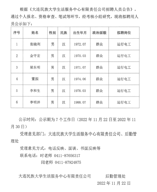 大连民族大学生活服务中心有限责任公司公开招聘电工拟聘用人员公示