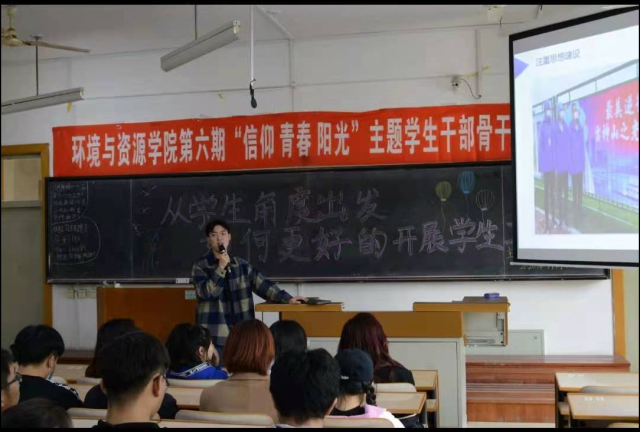 第三次骨干培训由环境工程系主任冉春秋老师主讲。以学习为主线进行讲解,举例说明了学习对未来工作、考研的重要性。他强调,作为学生干部,大家要在学习和生活中严格要求自己,起好模范带头作用。