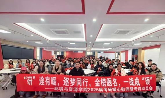 时光荏苒,岁末将至,2026届全国硕士研究生招生考试的脚步日益临近。为帮助考研学子缓解考前压力,调整心理状态,坚定必胜信念,2025年12月15日,环境与资源学院举行了2026届考研暖心慰问暨考前动员会。学院领导、辅导员齐聚现场,与百余名考研学子共同迎接这一重要时刻。