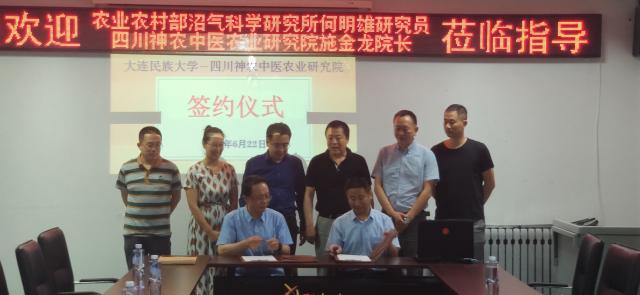 学校科技处弓晓杰处长、学院副院长、创新团队负责人崔玉波教授、项目负责人马克东副教授,农业农村部沼气科学研究所何明雄研究员,四川神农中医农业研究院施金龙院长参加签约仪式。