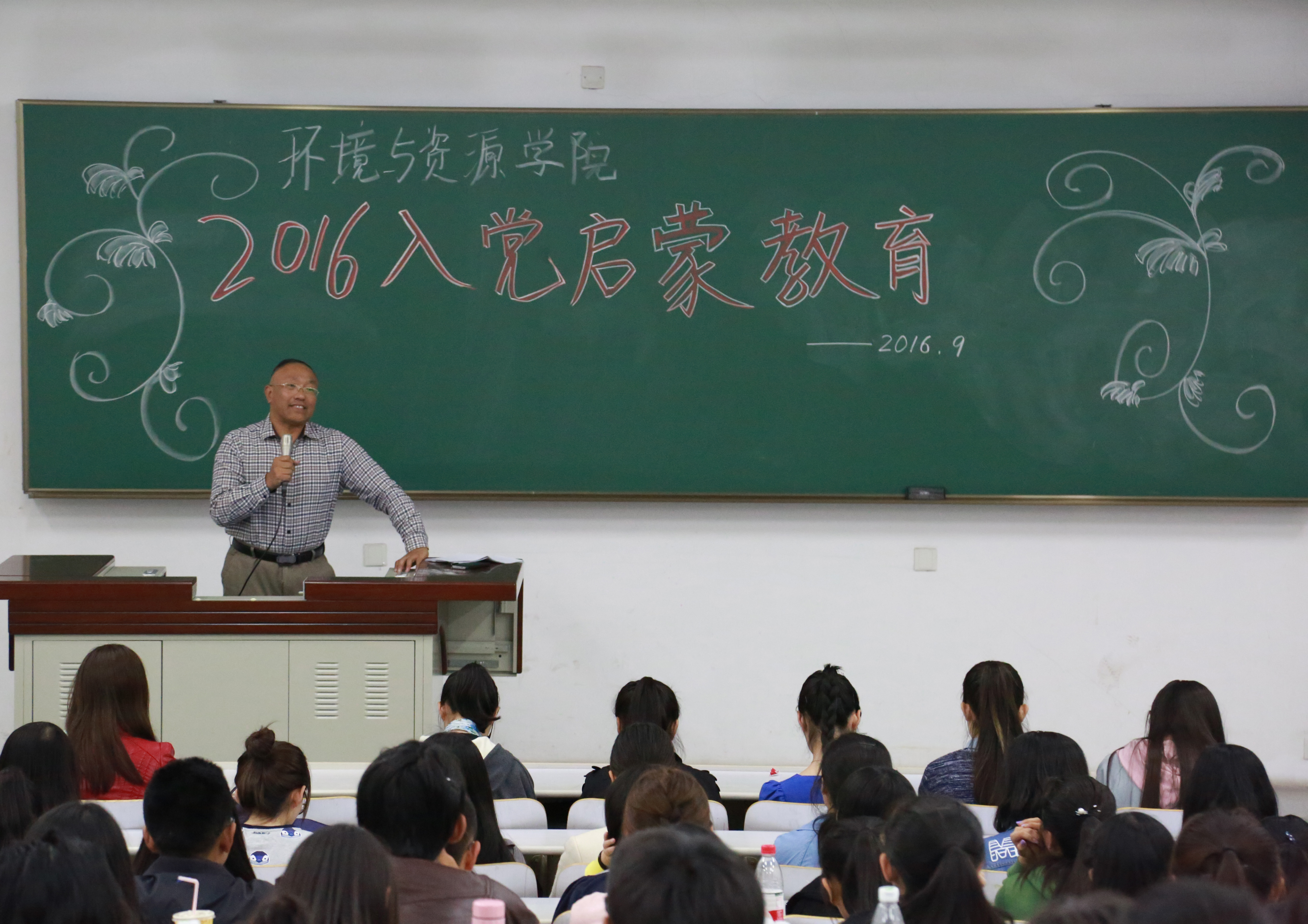 民大新闻网讯 9月28日晚,环境与资源学院在综C103召开2016级新生入学教育活动之入党启蒙教育讲座,学院党委书记李华戎担任主讲人,学院辅导员、2016级全体学生参加此次活动。
