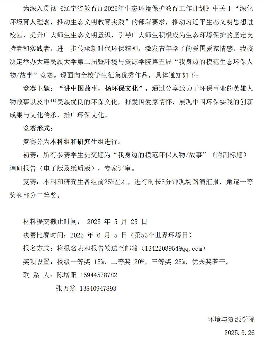 关于举办大连民族大学第二届暨环境与资源学院第五届“我身边的模范生态环保人物/故事”竞赛的通知