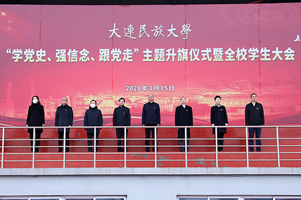 民大新闻网讯 2021年春季学期开学上课第一天,3月15日早晨,学校在两校区体育场同步举行“学党史、强信念、跟党走”主题升旗仪式暨全校学生大会。党委书记赵铸出席并讲话,党委副书记、校长丁克毅出席,党委副书记、副校长陈明华主持仪式。