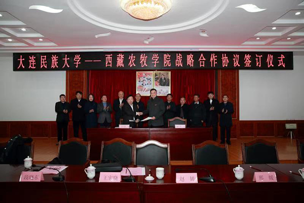 王宏晓代表国家民委教育科技司对协议的签订表示祝贺。他指出,大连民族大学是国家布局在东部沿海经济发达地区的民族高校,以工科为优势方向,建校以来,培养了数以万计的专门技术人才,学校积极履行社会责任,在服务政府决策和民族地区经济社会发展上发挥了重要作用,作出了突出贡献。希望两校以此次签约为契机,发挥优势、取长补短,重点围绕环境保护与生态修复、生物物种资源保护与利用、青藏高原生态保护与畜牧业发展进行深度合作,积极服务国家战略,服务西藏经济社会发展和长治久安,为新时代稳藏兴藏不断作出新的贡献。