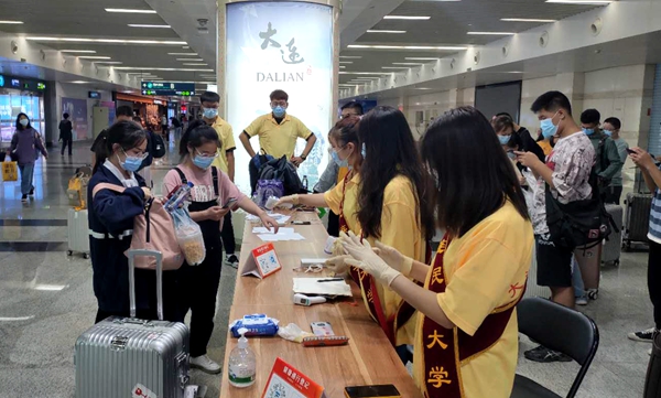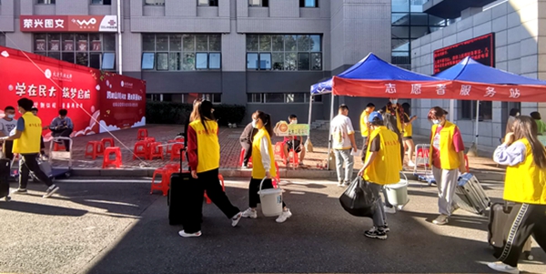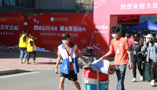 为保障新生顺利入校,天刚刚亮,几批学生志愿者们分别奔赴大连机场、大连火车站、大连北站和大连港,迎接新生及家长。民大校园内的学生志愿者们也坚守各自岗位,为新生入校提供服务保障。文法学院汉语言国际教育专业满族学生赵薇是一名大一新生,在进行短暂的休息整理后,她报名成为了一名迎新志愿者。“一到学校学长学姐就上前接过了行李,充分感受到了学校的热情,仿佛回到了大家庭一样温暖。作为新生,我更能感受到新生与家人分离的不舍和遥远奔波的疲惫,所以想尽自己所能去帮助到他们,把这种温暖传递给更多的人。”