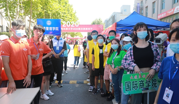 因为疫情防控的严格,今年迎新的安保工作更加周密。测量体温、提交检测核酸报告、扫描国务院或者辽事通健康码,这是新生入校的“第一关”。为了避免学生过度聚集,缩短学生入校报到流程,今年新生注册报到全部在网上进行,在今年增设的总报到处,学生只需要完成健康检测就能快速入校。家长可以通过直播,对民大校园文化、生活环境等有一个直观的了解。
