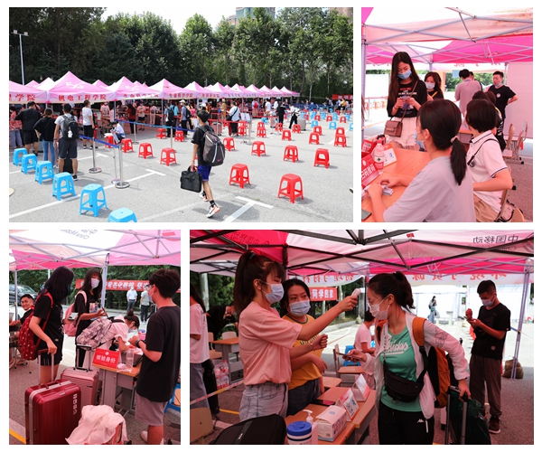 报到处分别设在开发区校区培训中心停车场、金石滩校区生活区西门入口、双D港校区南门,返校学生在报到入口处间隔 1 米以上有序排队,经过体温检测、出示健康通行码、核验校园一卡通或学生证、通过“今日校园”APP扫码签到后,便可回到宿舍。