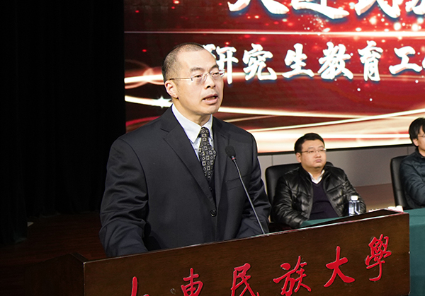 丁克毅发表讲话。他指出,学校始终高度重视研究生教育,将其作为加速发展的“强校之路”。学校从2011年获批“服务国家特殊需求研究生培养项目”,到2018年正式获批硕士学位授予单位,再到2019年获批“辽宁省学位与研究生教育工作先进单位”,都充分诠释了“艰苦创业、坚韧不拔、团结爱校、新校新办”的民大精神。在这个创新和改革紧密相联的时代,最具创新活力的青年将成为中国经济和社会发展的新引擎,这是青春的力量,也是中国的未来。研究生作为科研生力军,在推动国家创新驱动发展的历史进程中,使命光荣,责任重大。丁克毅希望,研究生们能够从点滴做起,共同营造优良的学风氛围,团结友爱,互帮互助,共同创建民族团结进步的校园文化,投身实践,全面发展,做新时代研究生,感恩生活,在学习中不断充实自我,自觉投身于建设创新型国家的伟大实践中,努力成长为有理想、有担当、有抱负的新时代青年人,用个人成才梦,共筑民大梦,中国梦!