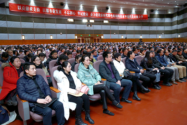 国家民委党组直属高校主题教育领导小组第一指导组副组长王扎西和指导组成员刘曜、畅飞,学校党委常委,校领导,党委委员、纪委委员,各二级党组织书记,各单位各部门主要负责人、处级领导干部、全体教师党员、在校学生党员参加大会。