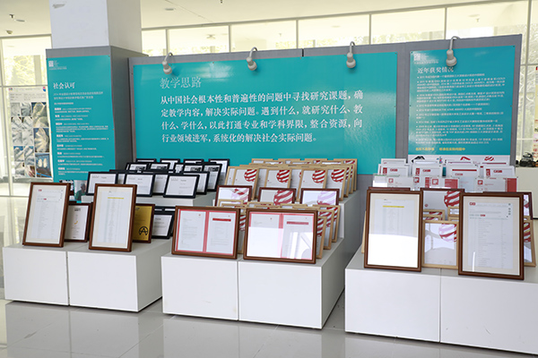 设计学院教育教学成果展馆成立于2009年,使用面积605平方米,分为三个展区。其中,“设计学院教育教学成果展”展区,主要展示设计学院建院以来始终秉承的教育教学思路、创新人才培养模式成果、教师科研成绩以及研究成果转化等;“社会主义核心价值观成果展”展区,依托价值观教育相关课程,主要展示了2000余名学生撰写的《家史家训》《大学生价值观调查报告》《社会结构变化图表》;“民族团结进步创建成果展”展区,以“民族团结一家亲,同心共筑中国梦”为主题,集中展示了王宁老师“全国民族团结进步模范个人”的奖章设计,金青松老师国家民委网站的LOGO设计、少数民族文创设计以及纪录片等作品。展馆成立十年来,逐渐具备了宣传、平台、教育、文化四大功能,建有完善的制度管理、活动管理、设施管理、档案管理流程,配备专兼职师生讲解员10人,面向校内外义务开放,每年接待政府、高校、企事业单位、地方中小学生和群众百余次。