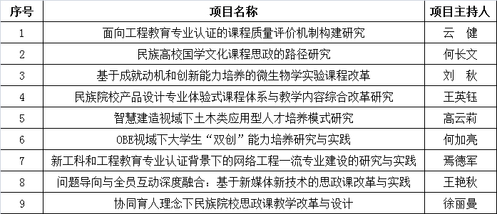 此次教学改革研究项目的获批是我校不断深化教育教学改革,努力提升民族高等教育内涵建设取得的成果。学校将以此为契机,进一步探索适合学校教学改革发展的新模式、新方法,围绕课程思政、OBE等新的教育理念,推动我校教学改革与研究工作的深入开展,推进新工科建设,创新人才培养机制,实现我校本科教育的可持续发展。同时学校将加强立项项目的过程管理,优化教育资源结构,培育高层次教学成果,加快建设一流本科教育,提高教育教学水平和人才培养质量。