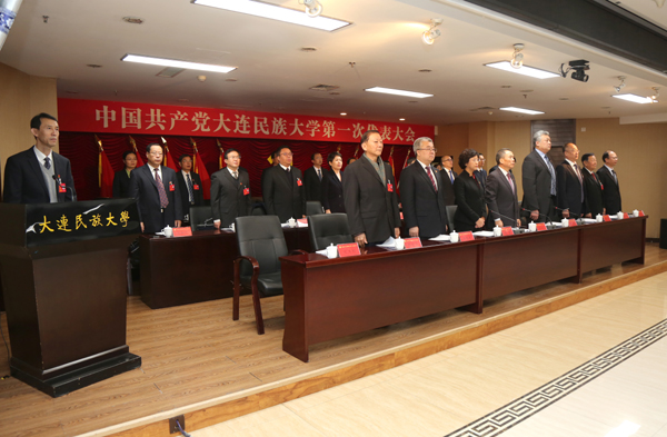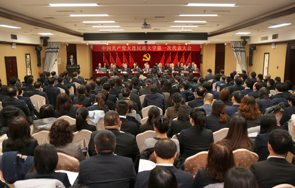 会场气氛热烈,主席台上方悬挂着“中国共产党大连民族大学第一次党员代表大会”的会标。衬幕正中悬挂党徽,十面鲜艳的红旗分列两侧。会场内“深入实施‘三个突出’战略 为建设特色鲜明的高水平现代化民族大学努力奋斗”的横幅表达了全体代表共同的心声。