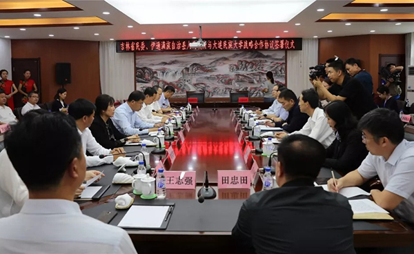 段晓东代表学校签署了《吉林省民委、大连民族大学战略合作协议》和《伊通满族自治县人民政府、大连民族大学战略合作协议》。根据协议,学校将与吉林省民委、伊通满族自治县人民政府建立府校地全面合作机制,针对民族地区优质特色资源、民族文化传承、智库建设、民族干部培训交流、教学实践基地建设等开展合作。