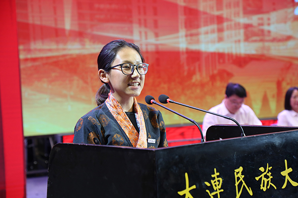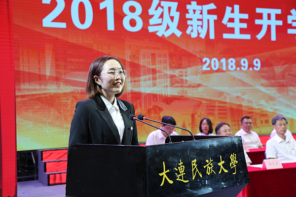 计算机技术领域2017级硕士研究生缪立欣同学代表在校生发言。缪立欣同学本科就读于我校,她表达了对学校的感恩之情,勉励学弟学妹珍惜大学求学时光,学会学习,善于反思,懂得合作,在多民族融合的环境中历练品格、健康身心、全面发展、担当社会责任。国际商学院会计学专业德庆旺姆同学代表新生发言。德庆旺姆同学来自西藏日喀则市,是一名藏族同学,今年获得了我校新生入学三等奖学金。她表达了对大学生活的向往,并立志在民大求真学问、练真本领,扣好人生的每一粒扣子,用奋斗和奉献作为青春的底色,不负父母嘱托,不负青春韶华,筑牢迈向社会的扎实根基。