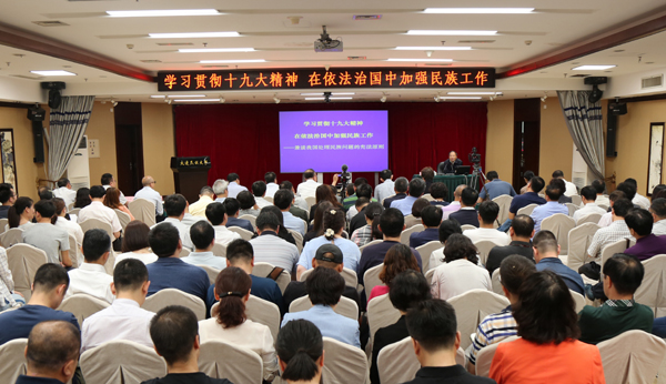 报告中,吴仕民以《学习贯彻十九大精神在依法治国中加强民族工作》为题,用生动的案例、典型的事件,从民族工作的法治思维、民族工作的法治原则和城市民族工作的依法推进三个方面,多层次、多角度阐述了当代中国民族发展的趋势、中国民族关系的本质、民族区域自治与国家统一的关系、中国民族政策的价值取向等问题,深刻分析了实行民族区域自治制度、促进各民族共同繁荣、妥善处理民族问题对促进我国政治、经济和社会发展的重要作用,提出了做好城市民族工作的基本方法和思路。
