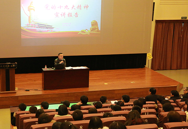 报告主要围绕党的十九大备受国内外关注的原因、报告起草情况,关于党的十九大精神的解读,对报告的总体评价等内容展开讲述。报告通过重要时间节点和国际影响力日益扩大两个角度阐释了党的十九大备受国内外关注的原因;从中央高度重视、充分调查研究和充分发扬民主三个方面概述了报告起草工作的简要情况;从鲜明的大会主题、对过去五年党和国家事业的总结和评价、中国特色社会主义进入新时代的重大论断、我国社会主要矛盾发生变化的重大论断、提出重大理论创新成果“习近平新时代中国特色社会主义思想”等十二个方面对党的十九大报告精神进行了深入的解读,强调了十九大报告关于教育工作、民族和宗教工作、意识形态工作、思想道德教育、青年的有关论述对民族高等教育工作的重要指导意义。以主题鲜明、立意高远、思想深刻、内容丰富的四个视角对党的十九大报告进行了总体评价,强调报告通篇贯穿着马克思主义的世界观和方法论,是一篇马克思主义的纲领性文献,是我们党迈进新时代、开启新征程、续写新篇章的政治宣言和行动指南。最后,王晓华向师生们推荐了《党的十九大报告》原文、《习近平在主持十九届中共中央政治局第一次集体学习时的讲话》、《中共中央关于认真学习宣传贯彻党的十九大精神的决定》、《党的十九大报告辅导读本》等重要学习材料。