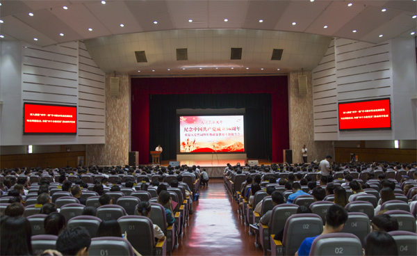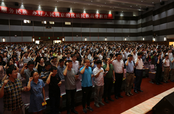 民大新闻网讯 6月28日,我校庆祝中国共产党成立96周年重温入党誓词活动暨形势政策教育专题报告会在太阳鸟报告厅举行。党员校领导、全体教工党员、学生党员、入党积极分子代表1000余人参会。大会由党委组织部部长袁传军主持。