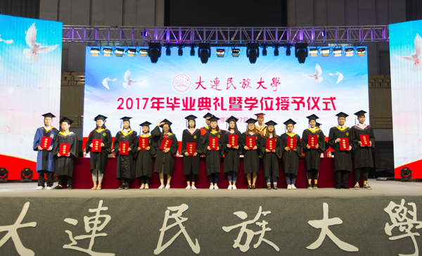 在隆重热烈的气氛中,校领导及学位评定委员会委员为毕业生拨流苏,颁发学位证书,并合影留念。