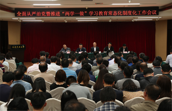 民大新闻网讯 为全面深入推进贯彻落实中央和国家民委党组、辽宁省委、大连市委、辽宁省高校工委关于全面从严治党和推进“两学一做”学习教育常态化制度化的要求,5月16日下午,学校召开全面从严治党工作会议暨推进“两学一做”学习教育常态化制度化工作会议。校领导赵铸、刘玉彬、王晓华、杜元虎、陈明华,金石滩校区党的建设工作委员会、服务保障党的建设工作委员会负责人,党委委员、纪委委员,全校处级干部,党总支书记、直属党支部书记、党支部书记参加会议。会议由校长刘玉彬主持。
