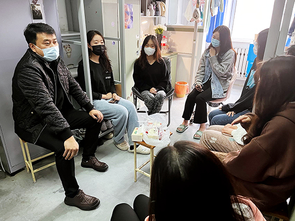 设计学院住校的领导班子、班导师加大力度深入学生寝室和工作室,通过走进学生线上课堂,走进学生寝室,走进工作室,走进食堂深入了解封校期间学生遇到的实际困难,通过一对一谈话的形式,拉近师生之间的距离,为学生第一时间解决学习好生活中的困惑。全体班导师、辅导员充分利疫情防控这堂大思政课教育引导学生,班导师经常在微信群给大家解答生活学习上的困惑,为线上学习保驾护航。