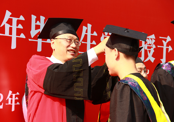 党委常委,校领导为毕业生扶正流苏,授予学位并合影留念。