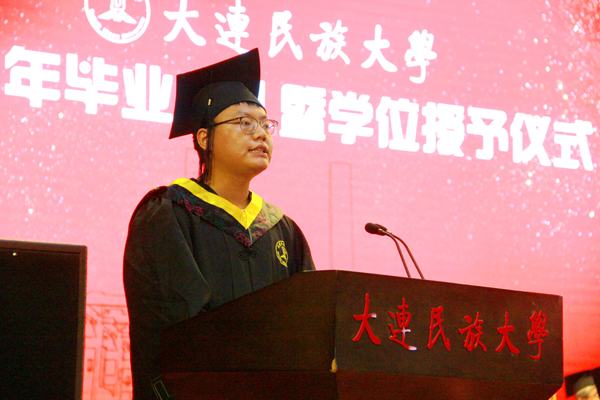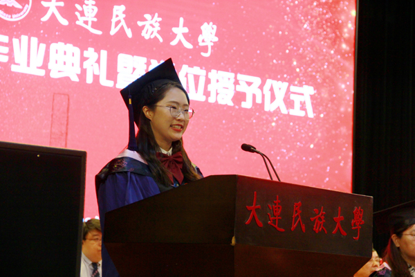 研究生毕业生代表、经济管理学院民族学佟琳,表达了对母校的滋养与塑造,对导师的引导与培育的感激之情,表示要牢记党的教诲,立志民族复兴,不负韶华,不负时代,不负人民,在青春的赛道上奋力奔跑,争取跑出当代青年的最好成绩。