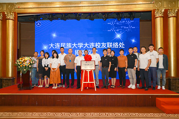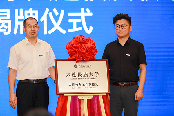 丁克毅和2004级经济学专业校友金永建为大连民族大学大连校友工作联络处揭牌。