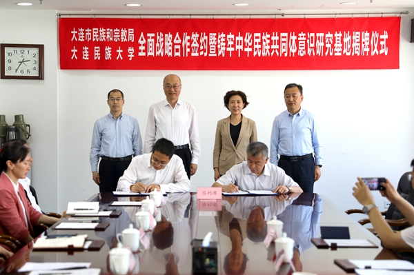 赵铸向长期以来关心和支持学校发展建设的大连市委统战部、大连市民宗局表示感谢。他指出,学校与大连市民宗局成功签订全面战略合作协议,共同为大连市铸牢中华民族共同体意识研究基地揭牌,是学校服务辽宁全面振兴新突破三年行动、服务大连“两先区”“三个中心”建设的一件大事,是进一步密切学校与大连市校地合作的一件好事,更是在国家民委、辽宁省政府、大连市政府三方共建学校中取得的一项重要成果。学校将紧紧围绕铸牢中华民族共同体意识,深入贯彻落实国家民委党组和辽宁省委、大连市委决策部署要求,主动担当、主动作为,充分发挥学校教育、科技、人才优势和民族理论研究优势,全力服务好地方统战和民族工作大局,切实当好大连市民族团结进步的示范窗口,加强铸牢中华民族共同体意识教育和理论研究,推动校地合作与共建产出更多高质量成果,共同在服务大连振兴发展和民族团结进步事业中取得新的更大成效。