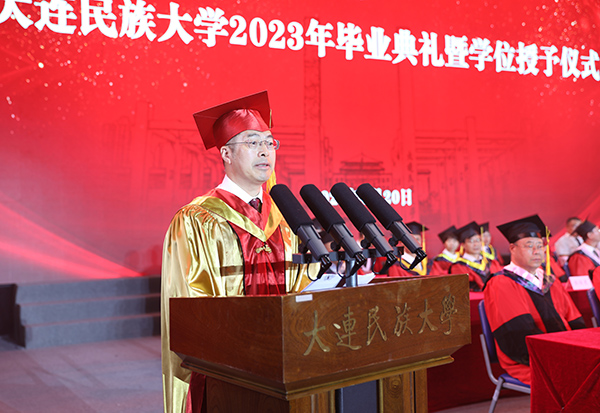 丁克毅代表教职员工向全体2023届毕业生致以最热烈的祝贺!向辛勤培育的老师和家长表示崇高的敬意!向专程返校的各届校友们表示热烈的欢迎!他表示,过去的四年,大家与母校共进步,一同见证了学校发展进程中的许多高光时刻,同学们是学校重要发展历史阶段的参与者、创造者、贡献者。对于即将踏上新征程、开启新生活的毕业生,他提出三点希望,一是要牢固树立休戚与共、荣辱与共、生死与共、命运与共的共同体理念,牢记中华民族一员的意识,继续胸怀“为中华民族伟大复兴而读书”的伟大志向,昂首向前,在强国建设、民族复兴新征程上留下民大人奋斗的足迹。二是要保持终身学习的劲头,积极适应时代之变,坚持终身学习的热情和习惯,不断提升能力本领,为中国式现代化建设贡献青春力量。三是要敢于追求自己的梦想,要从做好每一件小事做起,从完成每一项任务,干好每一份工作做起,把“自讨苦吃”“主动吃苦”作为追逐梦想的必修课,以更有力量的向上人生担当起家国的建设者、复兴的接力人、时代的圆梦者。