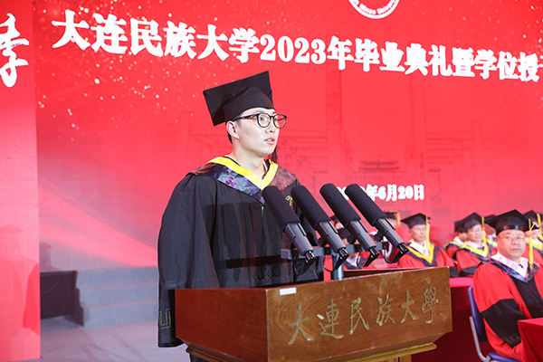 本科毕业生代表、土木工程学院土木工程专业武文彬回顾了大学学习生活的收获和感悟,感谢母校老师的辛勤培养。2023届毕业生将在今后的人生道路上,做传播铸牢中华民族共同体意识的火种,做爱校荣校的践行者和引领者,接好时代的接力棒,在青春的赛道上再次起跑。