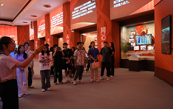 走进中华民族共同体体验馆,“中华一脉同心筑梦——中国共产党民族工作光辉历程和伟大成就”主题展、蒙藏学校旧址专题展和中华民族优秀文化体验区,展陈450余张照片、近300件实物、文献和档案。大家从实物、视频、照片上了解在中国共产党领导下中华民族面貌发生翻天覆地的历史性巨变,见证中国共产党百年民族工作的伟大成就。师生观展触摸见证革命先驱向少数民族青年讲述马克思主义的百年枣树、端详“彝海结盟”中手工缝制的红旗,了解蒙藏学校发展的红色记忆。在体验区,大家走进山东、内蒙古展区,欣赏融合各民族特色的中华文化体验项目,沉浸式感受“中华文化是各民族文化的集大成”。