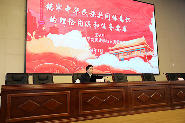 此次学习邀请到中国社会科学院民族学与人类学研究所所长、中国社会科学院大学社会与民族学院副院长、中央四部委铸牢中华民族共同体意识研究基地首席专家王延中教授来校作专题辅导报告。王延中教授从准确把握中华民族共同体的深刻内涵、深刻理解铸牢中华民族共同体意识的理论渊源、深刻认识铸牢中华民族共同体意识的重大意义、准确把握铸牢中华民族共同体意识的目标任务、重点深化铸牢中华民族共同体意识的实践路径五个方面,对铸牢中华民族共同体意识进行了深入讲解。报告主题鲜明、视野开阔、内涵丰富,既有深入浅出的理论阐述,又有实践层面的工作思考,为学校全面推进铸牢中华民族共同体意识各项工作提供了借鉴和指导。
