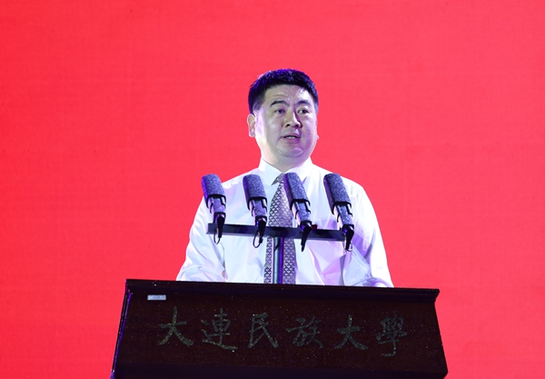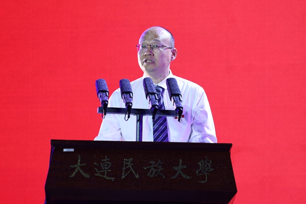赵立涛作了题为“在选择与热爱中做铸牢中华民族共同体意识的薪火传人”的讲话,代表学校党委和全校师生员工,向新同学表示衷心的祝贺和热烈的欢迎,向辛勤培育同学们的父母和师长表示崇高的敬意。他以“选择与热爱”为关键词,介绍了学校办学发展历程和取得的成绩。表示大连民族大学是在党的关怀下,伴随着国家改革开放成长起来的民族大学,是一所团结奋进的学校、一所充满活力的学校、一所文化浸润的学校。希望同学们热爱铸牢中华民族共同体意识的伟大事业,在民大这片团结沃土上广泛交往交流交融,厚植民族团结基因,牢固树立铸牢中华民族共同体意识,弘扬伟大抗战精神,赓续红色血脉,做堂堂正正、光荣自豪的中国人。热爱创新的火花和拼搏的滚烫,以自强不息的拼搏劲头,拓展创新思维,苦练专业本领,与民大同频共振,绘就新一代民大人的奋进篇章。热爱学校的人文情怀与价值追求,在浓郁学风中求真知,在文化浸润中明大德,将个人成长根植于国家与时代的进步之中,成为更有温度的追光者,为强国建设、民族复兴伟业贡献青春力量,实现人生价值。