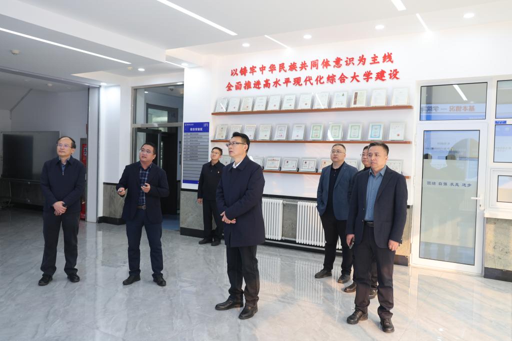 在校期间,王继成一行听取了学校整体办学情况介绍,观看了学校宣传片,参观了生物技术与资源利用教育部重点实验室、物理与材料工程学院以及设计学院教育教学成果展。